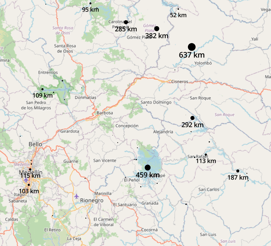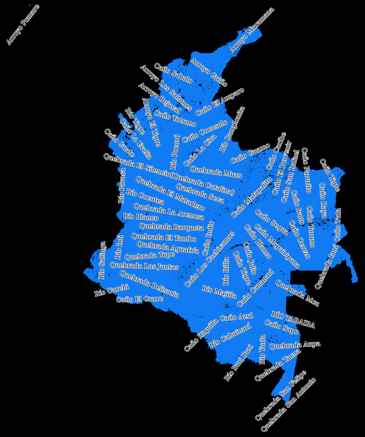 Lo importante de esta capa es que nos da los nombres de las quebradas y ríos de Colombia. El problema es que a veces el trazado de algunos ríos o quebradas no es preciso, y nos tenemos que basar en las herramientas previamente mencionadas para mapearlo correctamente.