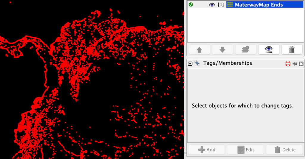 Para visualizar bien los puntos rojos de los fines de ríos, se puede poner por debajo la capa de OSM, para saber ubicarlo. Después de ubicado, se cambian (activan y desactivan) las otras capas de imagery.
