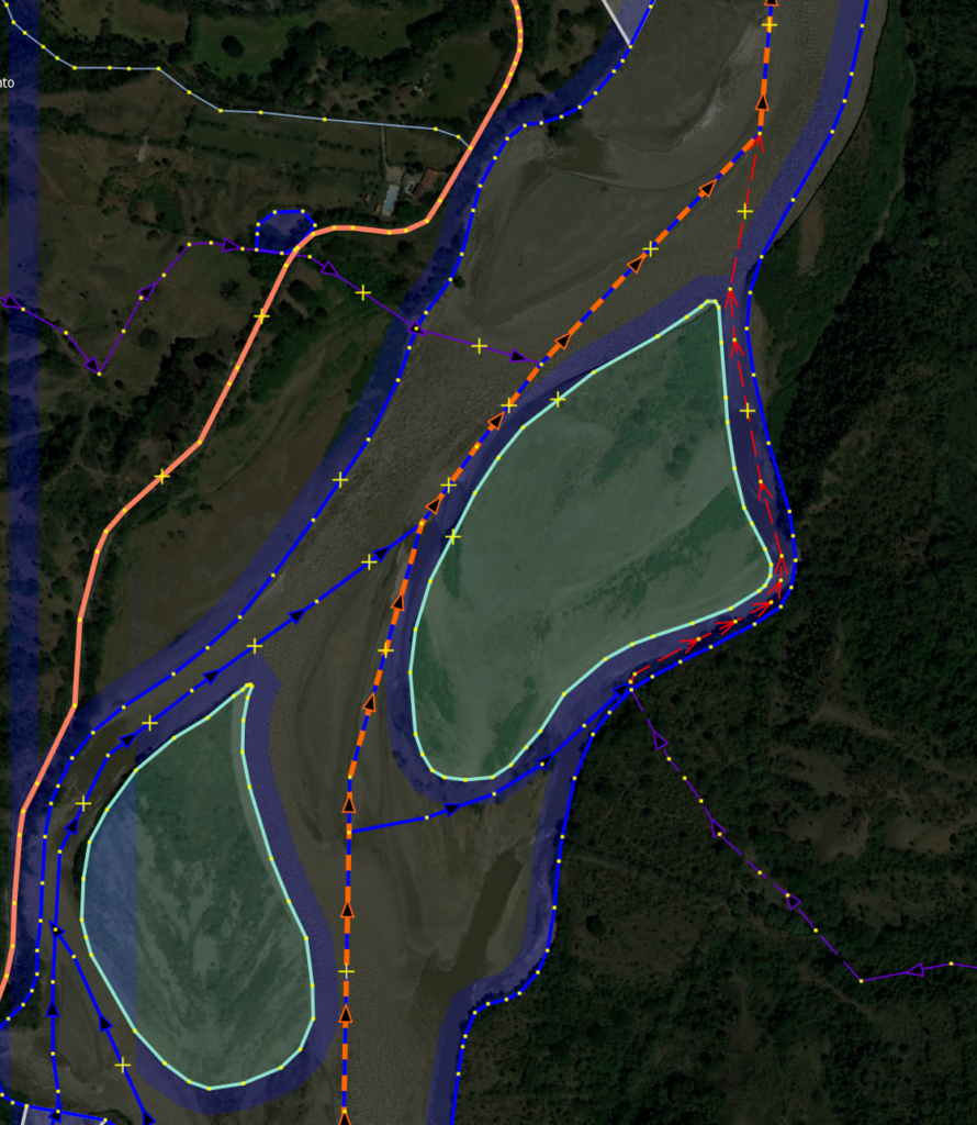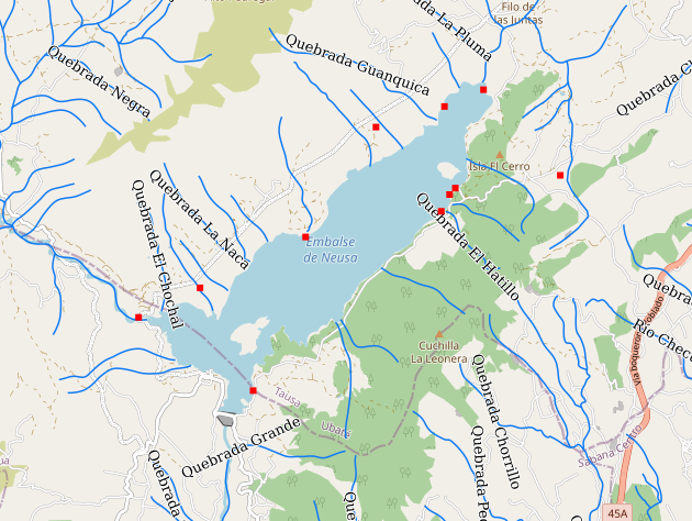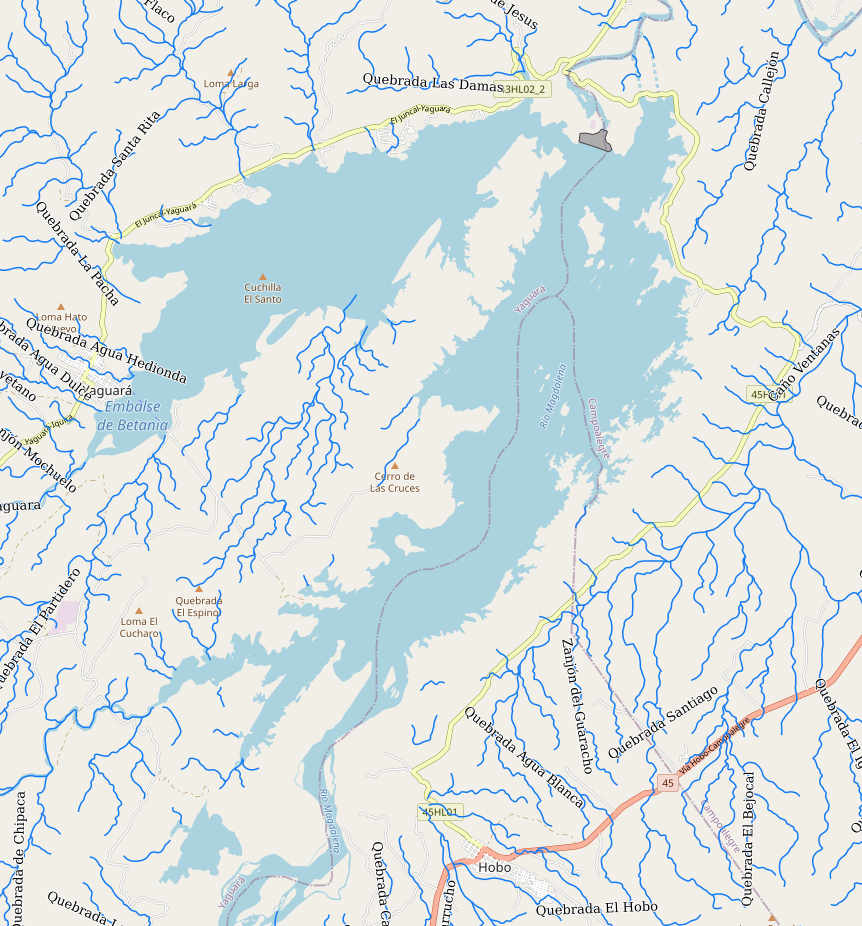 Aquí el embalse de Betania donde los ríos quebradas están conectados y no hay puntos rojos (Los tramos azules no son de OpenStreetMap sino de la capa de ríos del IGAC):