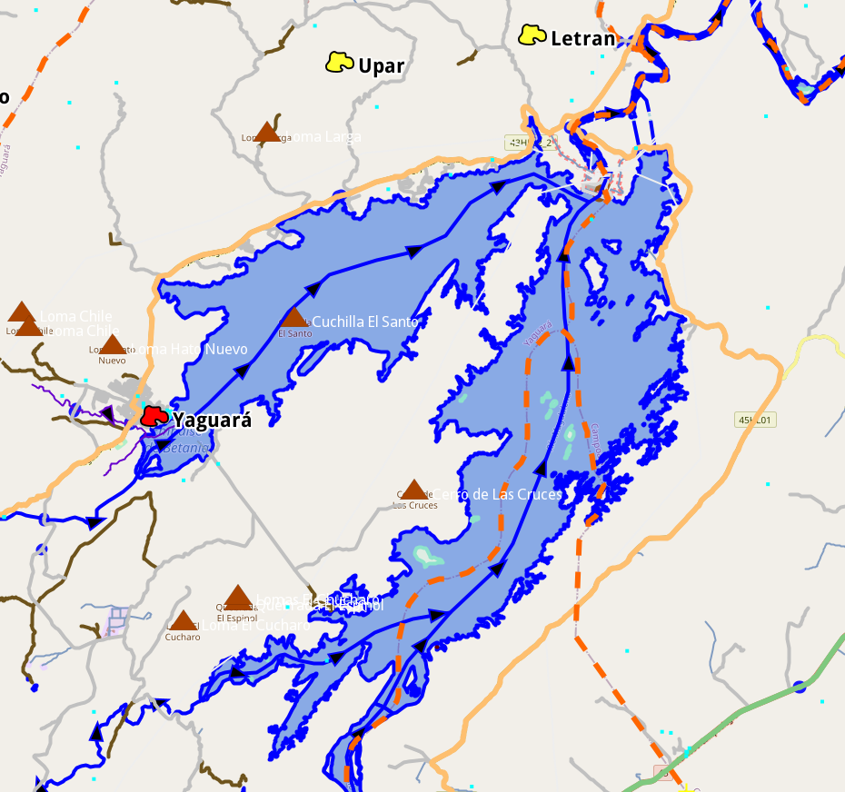 Un error común es dejar que el río termine en un embalse o laguna. En OpenStreetMap, se debe seguir el trayecto de un waterway en estos objetos (lake, reservoir) y conectarlo con el río o saliente de agua que corresponda.