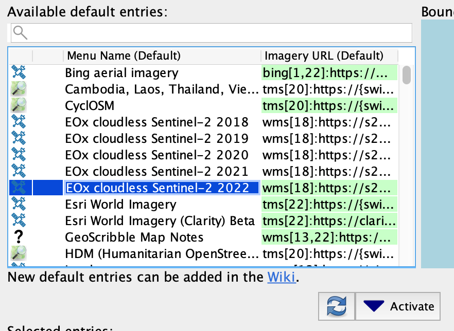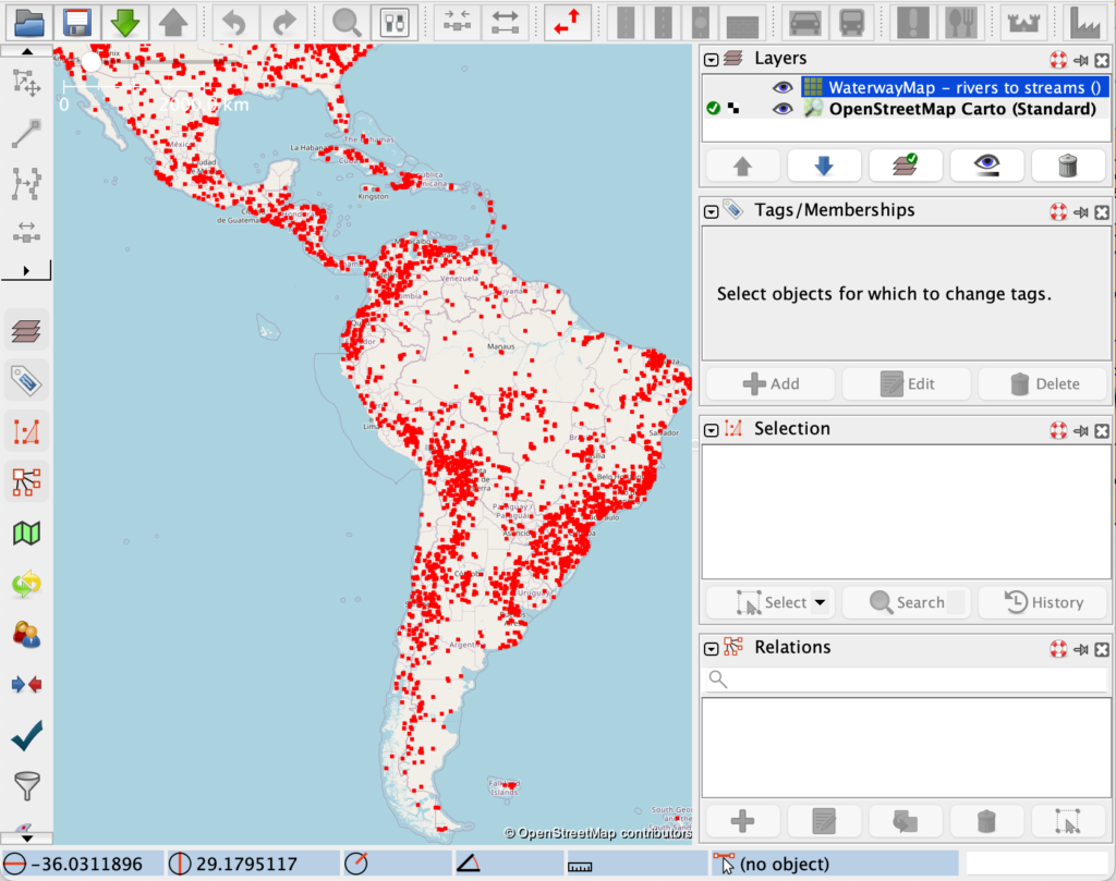 Si no aparece en JOSM esta capa, se puede activar por medio de las preferencias de imagery, y activar EOx Cloudless Sentinel-2 2022, 2023 o cualquier otro año; a la final los ríos cambian lentamente de cauce.