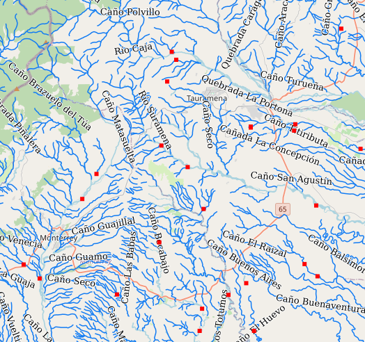 Los ríos y quebradas es una capa que ha liberado el Instituto Geográfico Agustín Codazzi como datos abiertos, y la comunidad OSM de Colombia mantiene una copia de estos datos en su GeoServer.