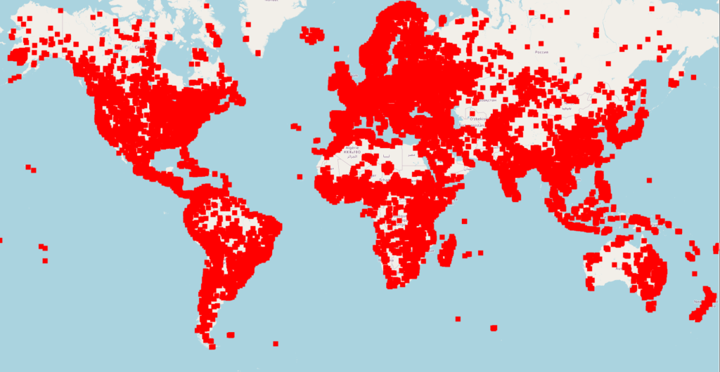 Cada punto rojo corresponde a un fin de río o quebrada, y solo deberían estar en las costas.