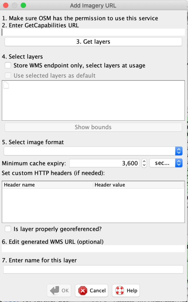 En la ventana que aparece se insertarán los valores de la capa WMS del GeoServer de OSM LatAm.