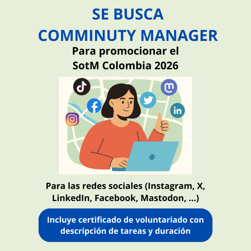 Para lograr que este evento llegue a más personas y comunidades, buscamos un/a Community Manager voluntario/a que nos ayude a promocionar SotM Colombia 2026 en redes sociales.