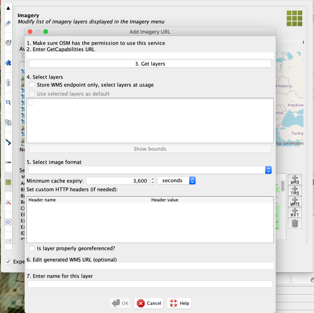 - Ahí pegas alguna de las URLs de arriba, y oprimes el botón “Get Layers”, esto te descargará las capas disponibles, y escoges la que necesites. Como parte del nombre, te recomendamos un nombre corto pero descriptivo, ya que puede ser usado como las “fuentes” de los changesets.