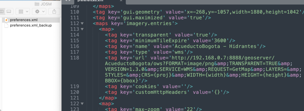 Para mayor facilidad, puedes modificar la configuración de JOSM abriendo el archivo de preferencias (preferences.xml), y pegar el contenido del siguiente archivo: preferences_imagery.xml. Todas las capas están dentro de las etiquetas <maps key='imagery.entries'>...</map> dentro del xpath.